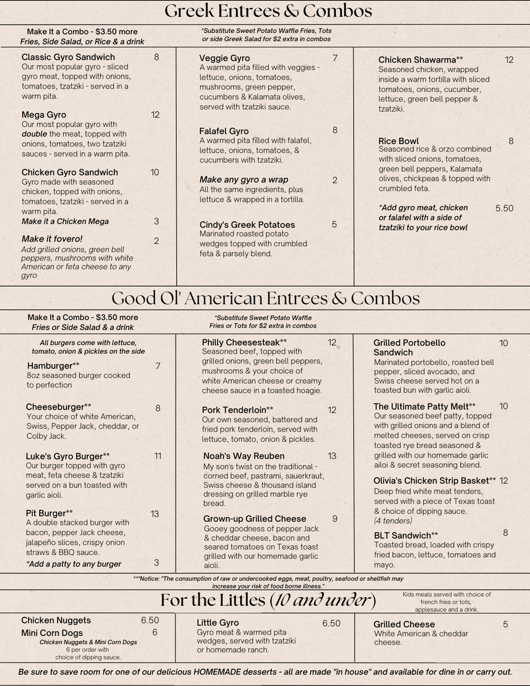 Greek, Homestyle and American Food plus desserts. Amazing Greek and American homestyle comfort food topped off with amazing scratch desserts. Fovero…. It’s amazing!